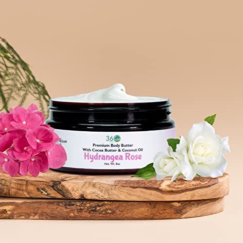 360Feel Hydrangea Rose – Moisturizing Body Butter With Cocoa Butter and Coconut Oil 8 Fl Oz – Hydrating Moisturizer with Pure Jojoba Oil and Cocoa Butter for Nourishing Essential Body Care, Cream